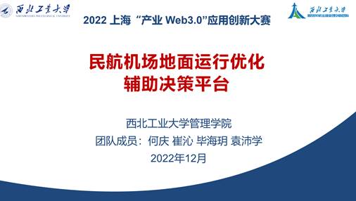 获得企业赛道“航运科技”奖和雏鹰成长组二等奖的“做的都对”团队由新葡的京集团35222vip的四位研究生构成,团队基于Web 3.0数字孪生、区块链技术的框架,进行算法研究实现了飞行器停机坪分配、地勤车辆作业调度以及飞行器与车辆的路径优化;并开发了民航机场地面运行优化辅助决策平台,实时地可视化展示机场地面状况及决策结果。实现了物理空间和虚拟空间的实时交互,有效解决了机场高峰时期地面运行管理的相关问题。
