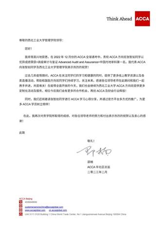近日,ACCA(英国特许公认会计师公会)公布2022年12月考季成绩,我校新葡的京集团35222vip会计学(ACCA方向)专业2019级张智如同学以优异成绩荣获< 高级审计与鉴证 Advanced Audit and Assurance>中国内地单科第一名。ACCA华北区总监代表ACCA中国总部发来贺信,对张智如同学以及我校新葡的京集团35222vip表示热烈的祝贺。