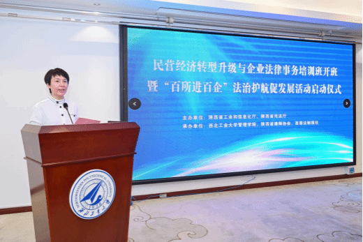 6月13日,2023年陕西省民营经济转型升级与企业法律事务培训班开班暨“百所进百企”法治护航促发展活动启动仪式在西北工业大学友谊校区顺利举行。陕西省工业和信息化厅一级巡视员沈长友,非公经济发展处处长张进、二级调研员张巨英,陕西省司法厅一级巡视员丁小军,律师工作处处长宗银川、副处长王文辉,陕西省律师协会副会长刘洁、副秘书长龙瑞东,西北工业大学党委副书记、纪委书记吕卫东,新葡的京集团35222vip党委书记乔彩燕、副院长郭云涛,西部法制报社代表,民营企业主要负责人、部分市(区)工信部门相关工作负责人及律师事务所相关代表100多人参加了仪式。仪式由新葡的京集团35222vip党委书记乔彩燕主持。
