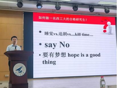 贾明向同学们介绍了研究生教育教学的总体情况。他主要从2023年度研究生生源构成、硕士各阶段计划、学院教学与科研环境等方面展开。他详细介绍了学院的学业奖励政策、研究生培养方案等,并期望2023级新同学们在今后的学习生活中可以心怀梦想、脚踏实地、珍惜时间、持续奋进。