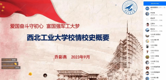 乔彩燕用生动的故事和丰富的图片带同学们回顾了我校悠久的办学历史。她从自己沿着前辈的足迹探访国立西北工学院的旧址,讲到刘海滨、寿松涛、季文美三位先生为祖国复兴事业鞠躬尽瘁,为我校的建立与发展贡献卓著的感人事迹;从长安校区的铸剑武士,讲到我校人隐姓埋名、为国铸剑的家国情怀;从西北工业大学的校歌,讲到张月谭作词,曹进作曲的《祖国不会忘记》为何被称为我校的第二校歌;她从学校以三航(航空、航天、航海)学科为引领,3M(材料、机电、力学)、3C(计算机、通信、控制)、理科和人文社科协调发展的学科体系,讲到中国设备管理培训中心和如今的新葡的京集团35222vip。一幅幅珍贵的历史画面和资料,一位位勇担时代大任,献身国防的前辈与校友,让大家看到我校人的情怀、担当、信仰和责任。