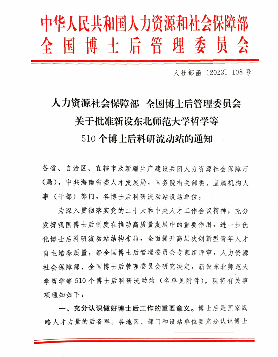 近日,人力资源和社会保障部、全国博士后管理委员会联合下发《关于批准设立东北师范大学哲学等510个博士后科研流动站的通知》(人社部函〔2023〕108号),新葡的京集团35222vip工商管理学博士后科研流动站批获设立!