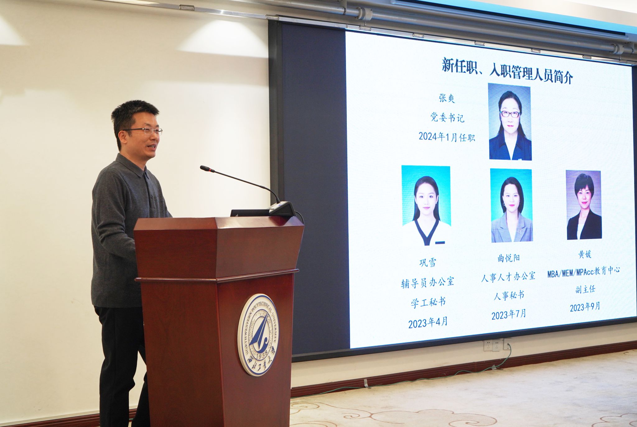 教职工大会上,副院长贾明、陈琳、郭云涛以及党委副书记王兆旭,院长助理李乘龙、邵婧根据各自分管工作,分别围绕教学、科研、学生管理、人才队伍建设、国际化等方面,结合学校近期有关要求,通报了学院现阶段各项工作的推进落实情况,并就下一步工作的重点事项及举措进行安排部署。