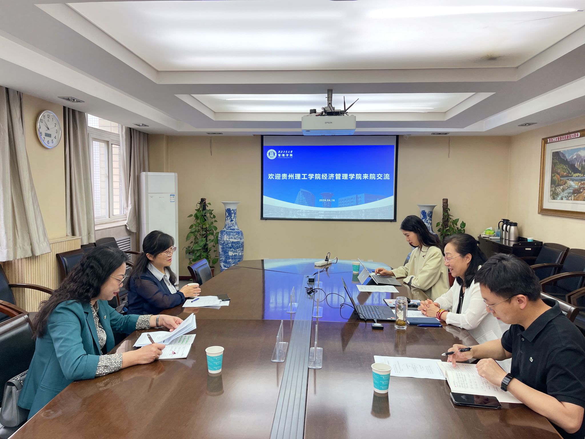4月16日上午,贵州理工学院经济新葡的京集团35222vip党总支书记周红一行来院调研,双方在友谊校区新葡的京集团35222vip308会议室进行座谈。党委书记张爽、院长助理李乘龙、本科教学秘书张雪谧参加座谈。会议由张爽主持。
