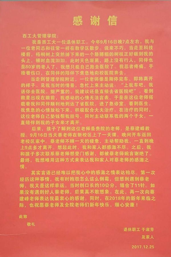 2017年9月16日晚退休职工于淑芳老人在校园散步时被掉落的树枝砸伤,头部出血。慌乱中急赴医院救治。途中,新葡的京集团35222vip蔡建峰教授路遇,主动驾车送于淑芳老人去省医院就诊。到医院后,垫钱挂号帮助于淑芳老人就诊,并联系其子女,直到她的子女到达医院蔡老师才离开。后于淑芳老人及其家人多次想登门感谢被蔡建峰教授婉拒,于是写下这封温暖的感谢信。作为一名教师,蔡建峰教授学识渊博、教书育人;作为一名党员,心怀大爱,热心帮助他人。可谓一言一行,为人师表。这种助人为乐的精神,让人感动,更值得大家学习。