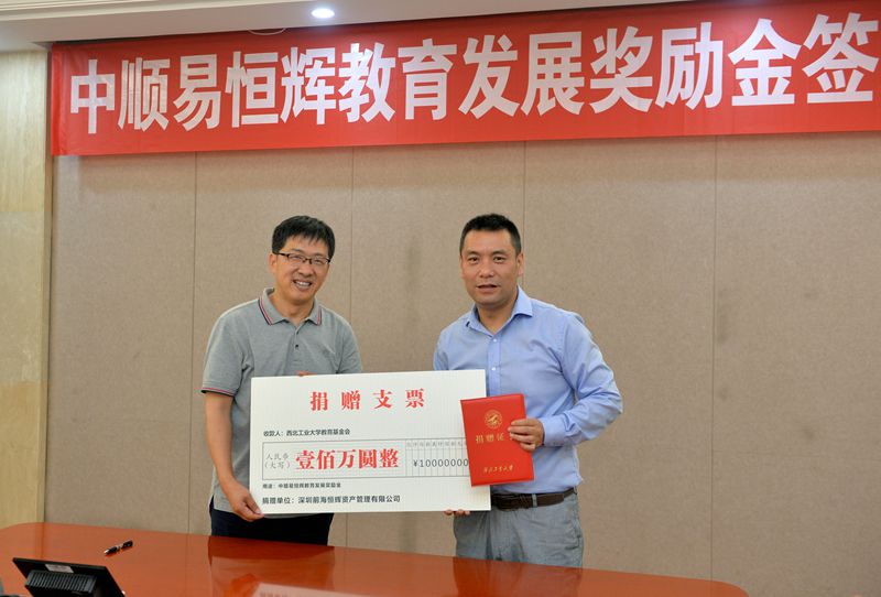 我校新闻网6月30日电(记者王凡华摄影记者郭友军)为支持母校西北工业大学教育事业发展,推进校企深度合作,6月29日,西北工业大学举行“中顺易恒辉教育发展奖励金”签约仪式。深圳前海恒辉资产管理有限公司(简称恒辉)向学校捐赠百万设立奖励金,用于优秀学生奖学金和助学金等。