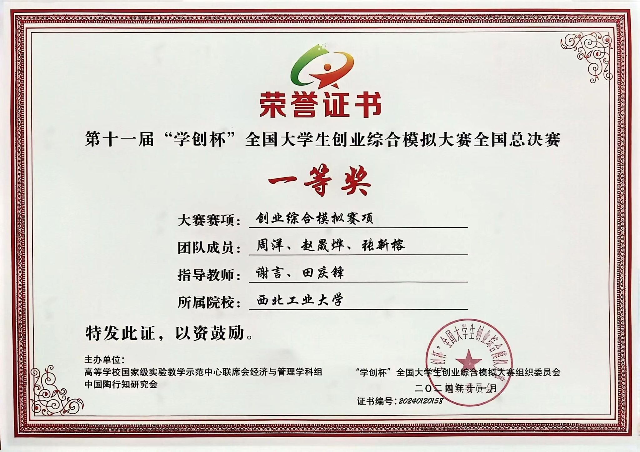 该赛事从2024年3月正式启动,校内选拔赛由西北工业大学企业经营与创业模拟创新实践基地承办,共有16支队伍报名参赛。经过校内选拔、陕西省赛及全国预选赛的层层选拔,历时8个月,在谢言副教授、田庆锋教授的指导下,在周珍副教授、邓巍副教授的支持下,新葡的京集团35222vip本科生周洋、赵晟烨、张新榕组成的参赛团队,凭借优异表现成功晋级全国总决赛,最终荣获全国一等奖。
