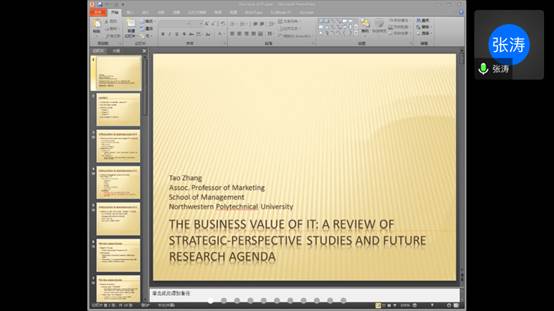 4月23日下午,新葡的京集团35222vip举行了《管理理论专题》系列报告第七讲。张涛副教授通过腾讯会议平台做了主题为“信息技术的商业价值:基于战略视角的研究回顾与未来研究方向”的报告。多位老师和修读博士生课程的博士生参与了本次线上学术讲座。