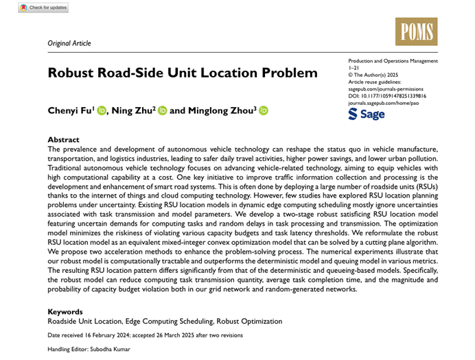 近日,新葡的京集团35222vip教授傅陈翼以第一作者在《Production and Operations Management》期刊上在线刊登题为“Robust Road-Side Unit Location Problem”的研究成果。合作者包括中国科学技术大学朱宁教授和复旦大学周明龙副教授。《Production and Operations Management》是运营管理领域顶级期刊,是美国University of Texas at Dallas所选出的商学院最顶尖24种学术期刊(简称UTD24)之一。