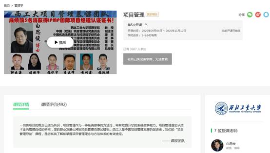 《项目管理》于2017年获西北工业大学慕课建设立项,2018年底正式上线,主要开课平台为爱课程(中国大学MOOC),在2019年秋季第三期开课时实现线上线下教学的融合。该课程先后被评为学校精品课程、陕西省精品课程、陕西省精品资源共享课程、陕西省精品在线开放课程。