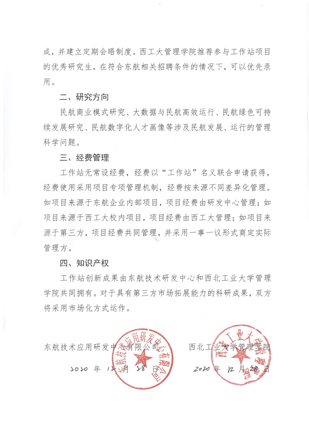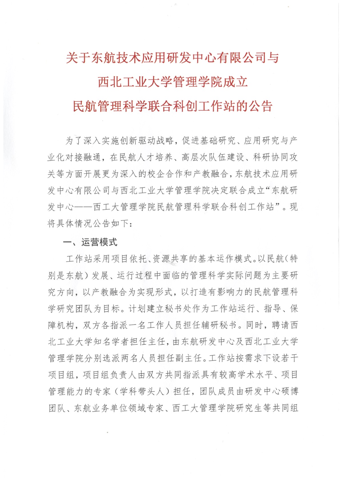 在西北工业大学与东航集团签署战略合作协议框架下,为了配合深入实施创新驱动战略,促进研究与产业化的对接的校企合作和产教对接融通,东航技术应用研发中心有限公司与新葡的京集团35222vip联合成立“东航研发中心——我校新葡的京集团35222vip民航管理科学科创工作站”。