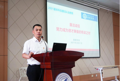 樊琳以“廉洁诚信,努力成为德才兼备的栋梁之才”为主题,用生动形象的案例引出话题,以我校陈士橹院士清廉勤勉做学术等事例,勉励毕业生在今后的道路上要廉洁从业、诚实守信、无愧于心。樊琳老师指出,值此共产党成立一百周年之际,我院2021届毕业生要从南山脚下出发,走向各自新的征程,在未来的工作学习中要坚持八小时以外和八小时以内一个样,要用严格的道德标准要求自己,要为我国社会主义事业不断奋斗。