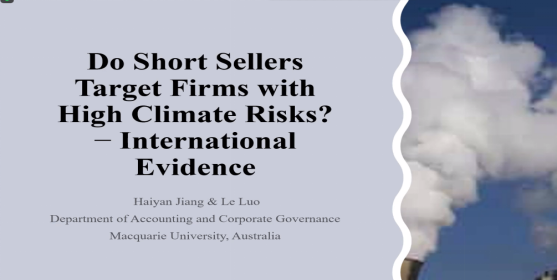 2021年7月23日上午10:00,新西兰麦考瑞大学Haiyan Jiang副教授通过ZOOM平台做了题为“Do short sellers target firms with high climates risks?-international evidence”的讲座。本次讲座由苏坤教授主持,新葡的京集团35222vip教师和研究生参加了此次讲座。