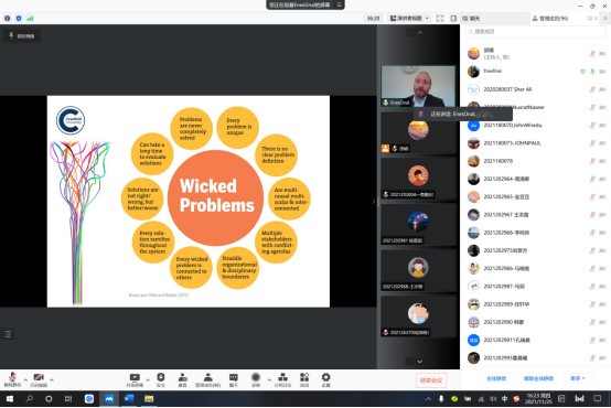 随后,Enes副教授用丰富的图表与数据对不同类型的循环经济模式进行了系统性的讲解,指出目前最大的难点在于实现一个有效率有效果有收益的设计结果,同时强调大家在此过程中不应该将面对的问题按难度排先后,而是应该将问题归结到不同的主题下一同解决。为了更好的进行互动,Enes副教授鼓励同学们随时在聊天室内表达自己的看法或疑问,然后在讲授过程中融合ppt内容进行解答,这样不但锻炼了同学们对于循环经济的认识并且加强了同学们的英语应用能力。