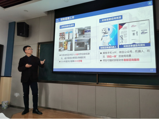 其次,张鹏老师介绍了财务管理的信息化方法。他从学校的历史渊源讲起,讲解了学校在“航空、航天、航海”领域人才培养和科学研究取得的成就。然后以西北工业大学财务工作为例,结合工作实际,重点讲解了财务共享中心中统一支付平台、财政电子票据系统、网上报账平台等15个我系统。最后,介绍了财务管理流程以及财务工作中存在的问题和改进实践。