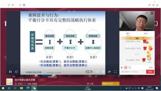 刘俊勇教授以《基于中国实践推动中国特色管理会计理论构建》为题,描述了管理会计在企业管理中的应用,论述了从理论基础、环境、工具、边界等方面构建中国特色管理会计理论体系的思路。刘教授通过对华润、联通、河南省肿瘤医院等不同类型企事业单位的案例分析,深入浅出地论述了管理会计体系构建的经验和难点,提出管理会计工作者应积极营造良好的管理会计环境,系统构建管理会计体系,综合应用多种管理控制方式,夯实基于多学科的管理会计理论基础,从而打破传统会计边界并积极转变心智模式。讲座结束之后,同学们通过线上留言方式与刘教授就管理会计领域等热点问题展开了积极互动。最后金帆主任对此次讲座进行了总结,他认为刘俊勇教授的讲座非常接地气,内容丰富,有场景实例也有理论分析,对青年学子学习和实践管理会计理论与方法具有很大帮助。同时寄望青年学子在工作实践中大胆创新,为构建中国特色管理会计体系做出贡献。