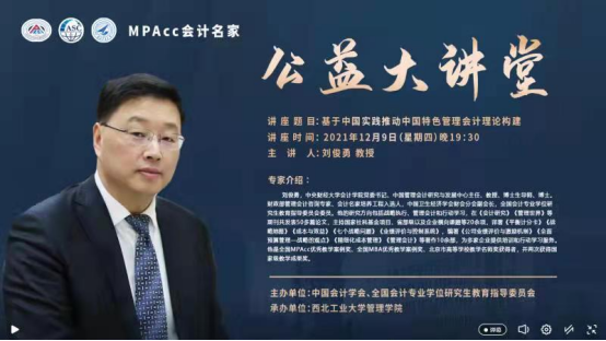 12月9日晚,由中国会计学会、全国会计专业学位研究生教育指导委员会主办,新葡的京集团35222vip承办的“MPAcc会计名家公益大讲堂”通过线上直播方式顺利举行。本次讲座特邀全国会计专业学位研究生教育指导委员会委员、MPAcc会计名家、中央财经大学会计学院博士生导师刘俊勇教授主讲。讲座由新葡的京集团35222vipMPAcc教育中心金帆主任主持,新葡的京集团35222vip及全国各兄弟院校共计1600余名师生在线聆听了本次讲座。