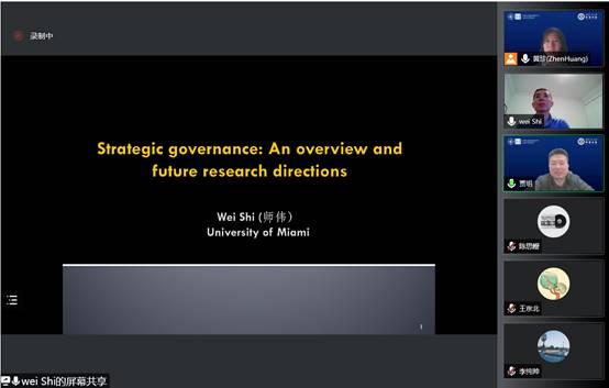 2021年12月22日晚上20:00,应新葡的京集团35222vip邀请,迈阿密大学迈阿密赫伯特商学院Wei Shi副教授通过腾讯会议平台针对“战略治理:综述与未来研究方向(Strategic governance: An overview and future research directions)”进行了学术报告。本次学术报告邀请了新葡的京集团35222vip副院长、新时代企业高质量发展研究中心主任贾明教授参会,并在学术报告前对Wei Shi副教授进行了简要介绍。本次学术报告由黄珍老师主持,本校师生等共百余人在线参与了此次学术报告。