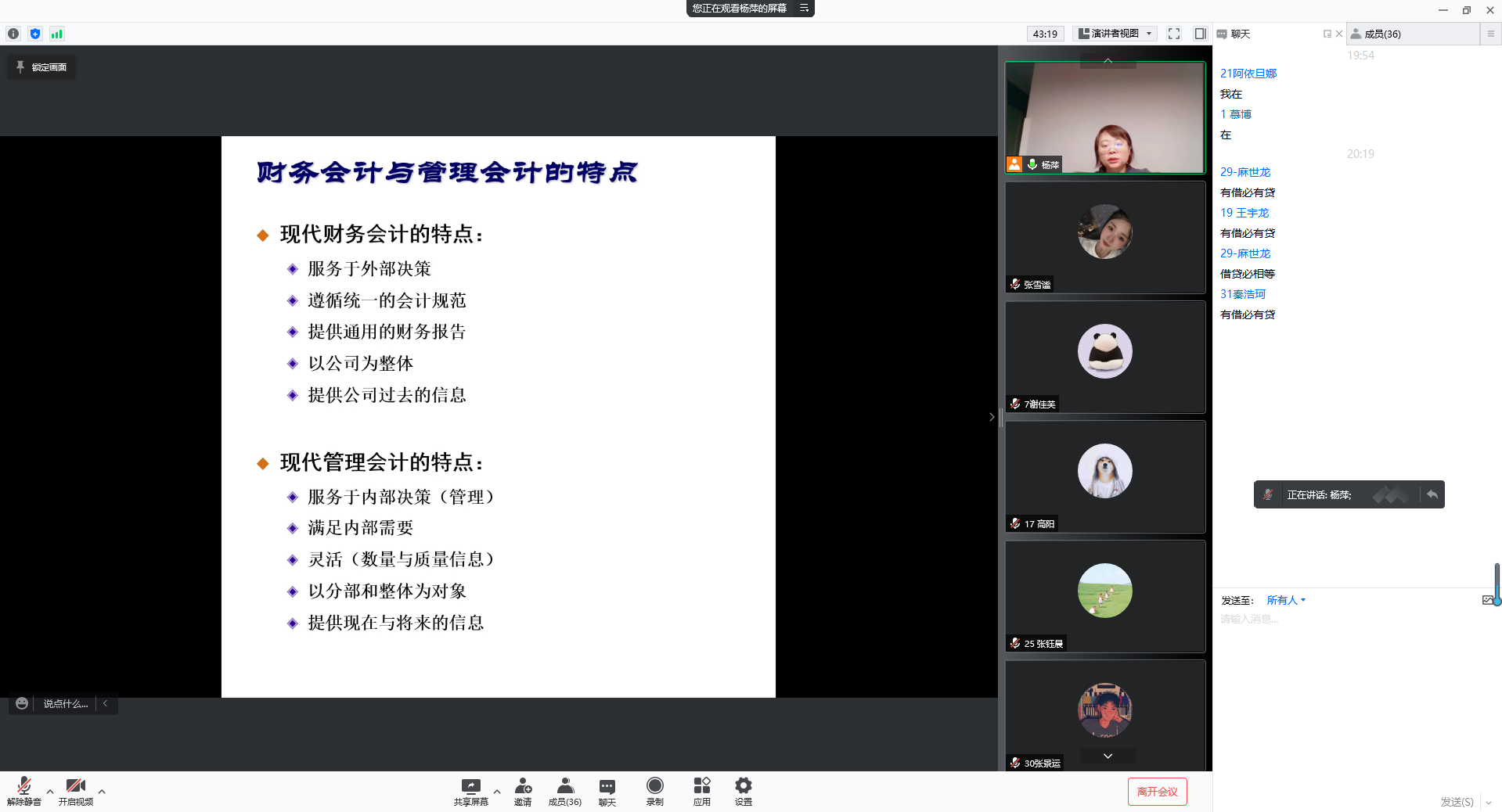 虽然是线上教学,但老师们对于同学们的上课要求并没有改变,上课过程当中,很多老师要求学生打开摄像头,确保学生精神饱满的进行学习。在杨萍老师的高级财务管理课程中,杨老师设置了很多小组讨论环节,鉴于疫情下学生都在宿舍进行学习,杨老师根据学生宿舍进行了不同的分组,同一宿舍的学生分配在一个小组,确保线上讨论时不会造成交叉干扰。