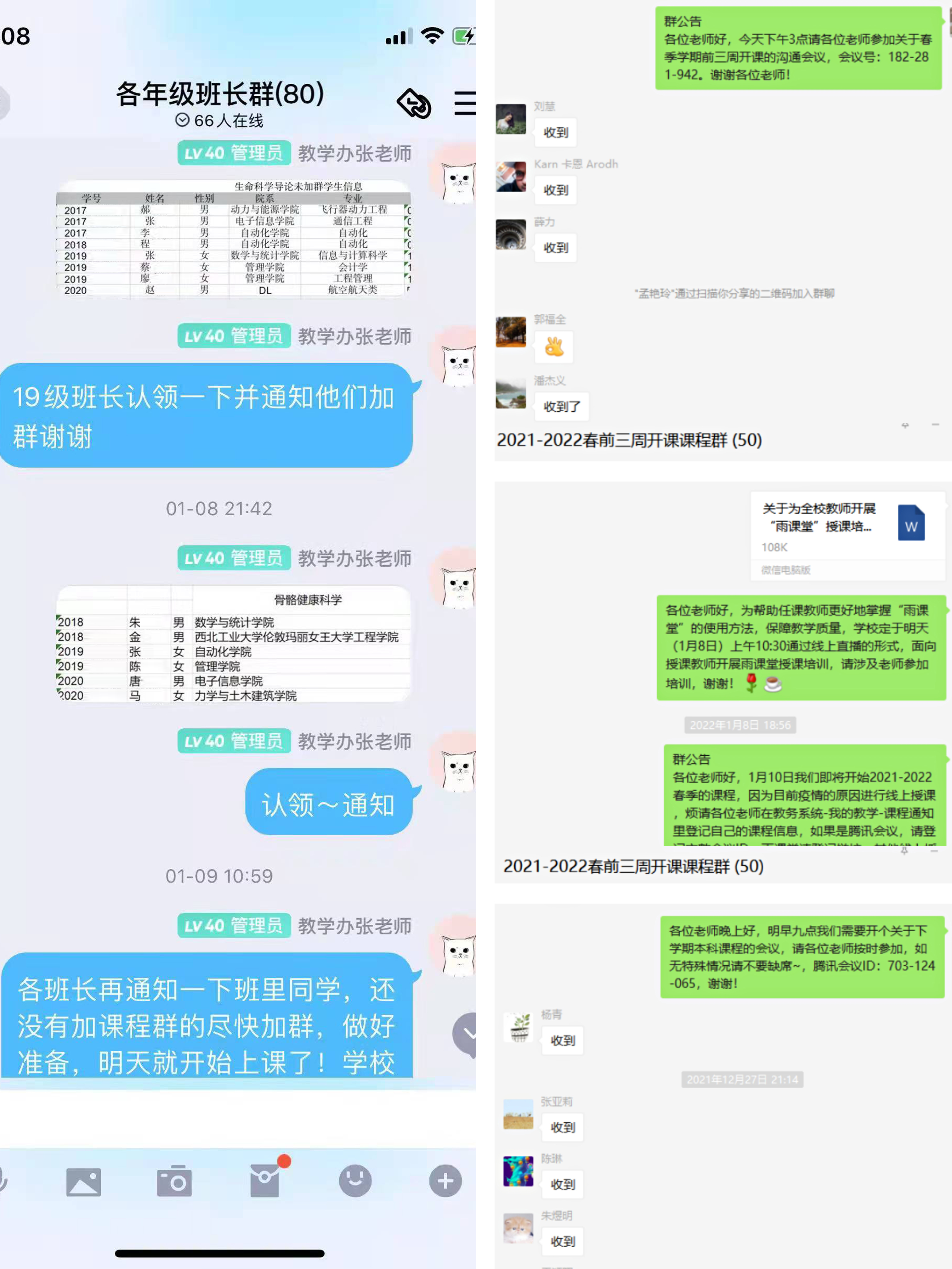 为了保障线上教学工作顺利开展,开课前,学院多次组织召开线上教学研讨工作会,明确线上授课要求,交流线上授课方式,对常见线上授课问题提出解决办法并做好预案,确保疫情防控和教育教学工作有序开展。教师们通过教务系统上传在线授课信息,提前建立课程微信群、QQ群等。教师、辅导员、班主任及教学管理人员,通过各种方式督促学生及时进入课程群组,确保每一位学生知晓自己课程的线上进入方式,及时解答同学们对于课程的各种问题。教师在课程群每节开课前进行课程提醒,发送上课线上链接,分享课程资料,为学生答疑解惑等,充分做好了线上授课的各项准备工作。