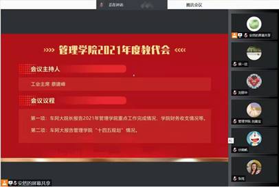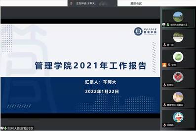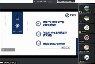院长车阿大作“我院2021年度工作报告”,围绕学科建设、人才培养、教学科研、师资队伍建设、国际交流合作等方面所开展的重要工作和所取得的主要成绩进行了重点汇报,并就2021年学院制度建设情况及财务收支情况进行说明。他表示,今年在全体教职工的共同努力下,学院学科建设取得较大进展、师资队伍建设成果良好、人才培养成效明显、标志性成果取得突破,成功增列工商管理一级学科博士学位授权点、AACSB初始资格认证报告(EA)通过认证委员会审核等,在2021年校级综合考评中取得了管文类第一的成绩。