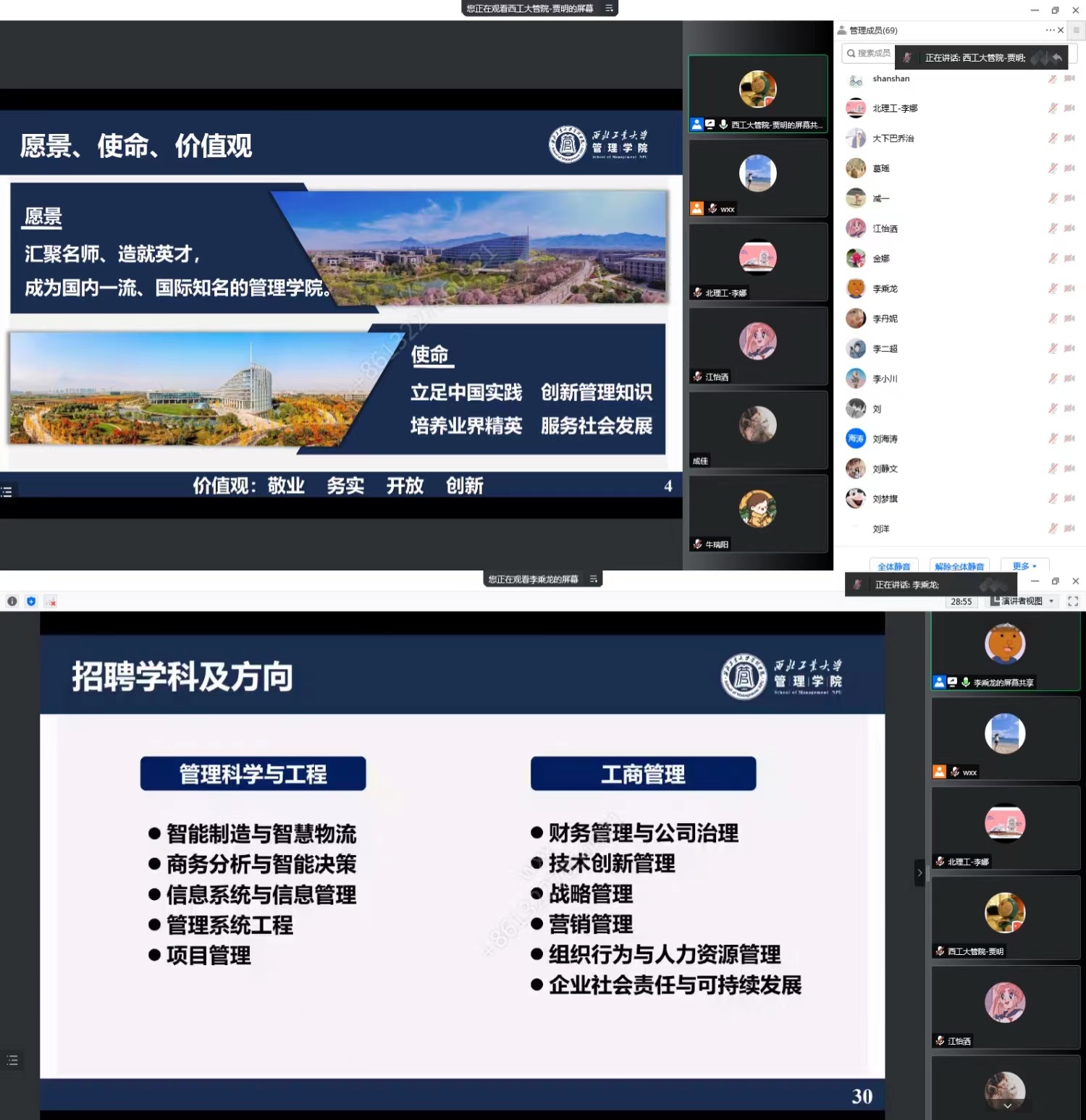 分享会环节结束后,进入到本次分论坛的第二个环节——学院人才招聘宣讲会。来自德国多特蒙德大学、加拿大曼尼托巴大学、浙江大学、中山大学等国内外十余名意向应聘学者一同参加了此次宣讲会。宣讲会由贾明全面介绍了学院的整体情况包括院史院情、师资队伍、科学研究、人才培养和国际合作等方面,李乘龙则负责详细介绍了学院目前的人才引进政策、人才成长路径及薪酬待遇等方面内容,明确表达了新葡的京集团35222vip广纳贤才、争创一流的发展思想,对各位青年学者到场参会表示热烈欢迎的同时也热情邀请各位青年学者能够在日后加盟学院,为学院的发展贡献力量。宣讲环节结束后,李乘龙和学院人事秘书王霄与各位青年学者们就各自关心的问题展开了一对一的解答和交流。