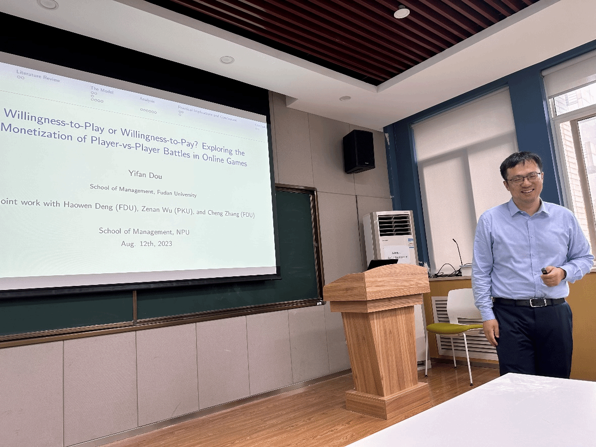 2023年8月12日上午,应新葡的京集团35222vip邀请,复旦大学新葡的京集团35222vip窦一凡教授在长安校区新葡的京集团35222vip作了题为 Willingness-to-Play or Willingness-to-Pay? Exploring the Monetization of Player-vs-Player Battles in Online Games 的学术报告。本次活动由信息我系王鹏副教授主持,新葡的京集团35222vip教师和研究生参加了报告会。