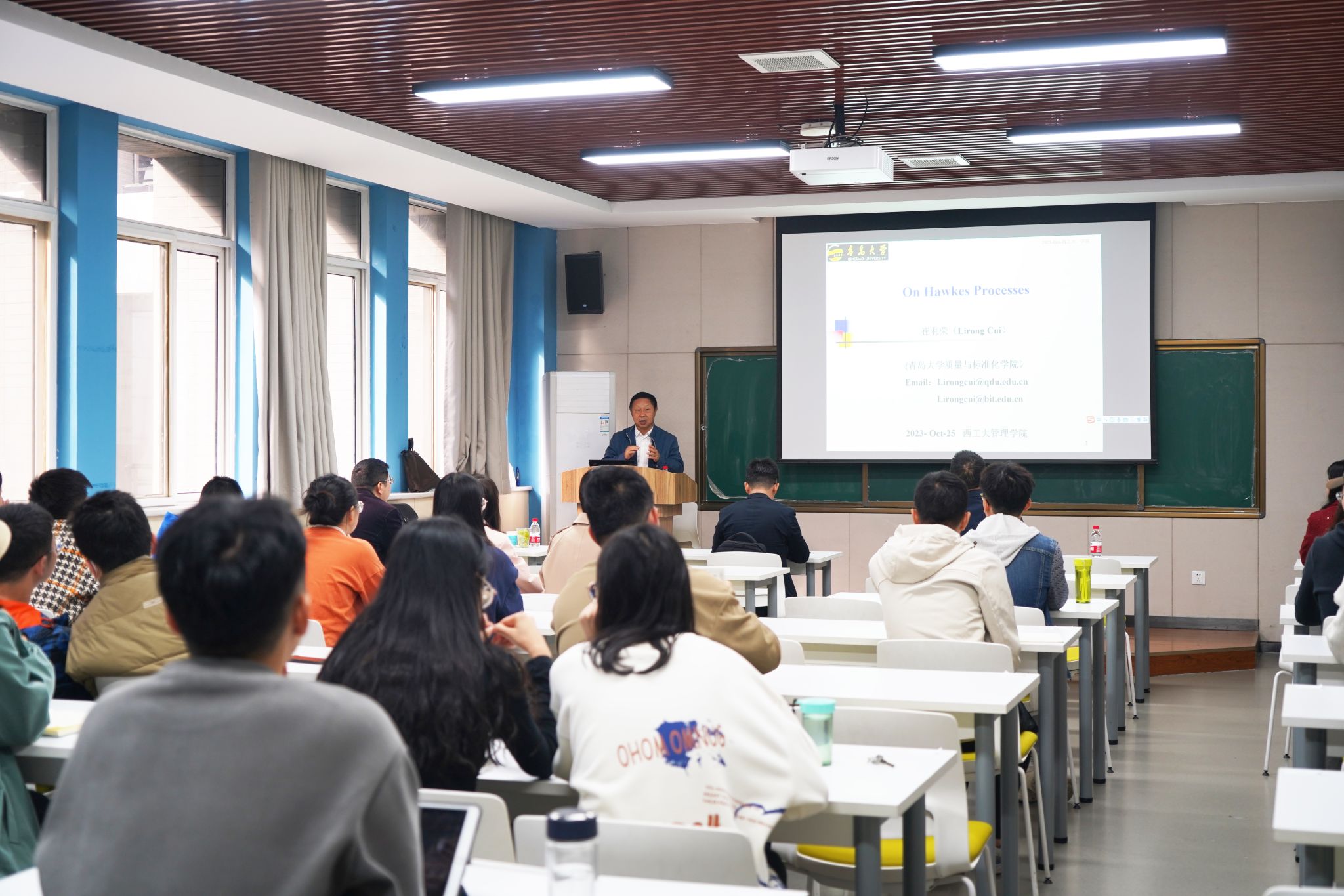 2023年10月25日上午,应新葡的京集团35222vip邀请,青岛大学崔利荣教授于我院210作了以“论霍克斯过程”为主题的学术讲座。本次讲座由车阿大院长主持,新葡的京集团35222vip教师及研究生参加了此次讲座。
