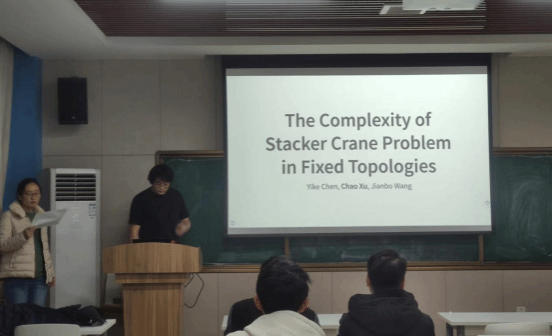 会议伊始,王阳教授对许超教授的专业背景、科研成果做了简单介绍。新葡的京集团35222vip师生对许超教授的到来表示了热烈的欢迎。此次报告会,许超教授首先基于现实业务场景对堆垛机问题(Stacker Crane Problem, SCP)进行介绍。其次,对比旅行商问题(TSP), 指出SCP更加复杂,属于NP难问题,在特定类型的图中,路径和环上的SCP问题的复杂性等同于最小生成树问题。最后,通过推导证明在固定的拓扑结构上,SCP问题存在多项式时间算法。