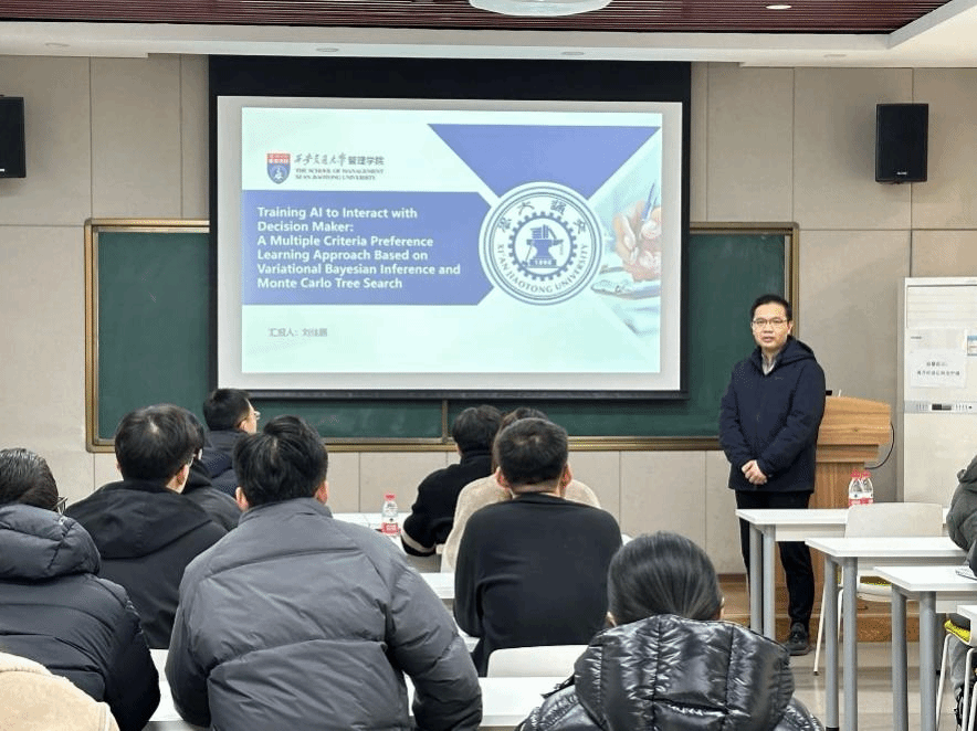 2024年1月10日,应新葡的京集团35222vip邀请,西安交通大学新葡的京集团35222vip信息系统与智能商务系刘佳鹏教授做客长安校区学院楼214报告厅与学院师生展开学术交流,作题为“训练人工智能与决策者交互:基于变分贝叶斯推理和蒙特卡罗树搜索的多准则偏好学习方法”的学术报告。本次报告由李乘龙副教授主持,学院教师和研究生参加了此次报告会。会议开始前,李乘龙老师对刘佳鹏的个人情况、学术成果等进行了简要介绍,对他的到来表示了热烈欢迎。