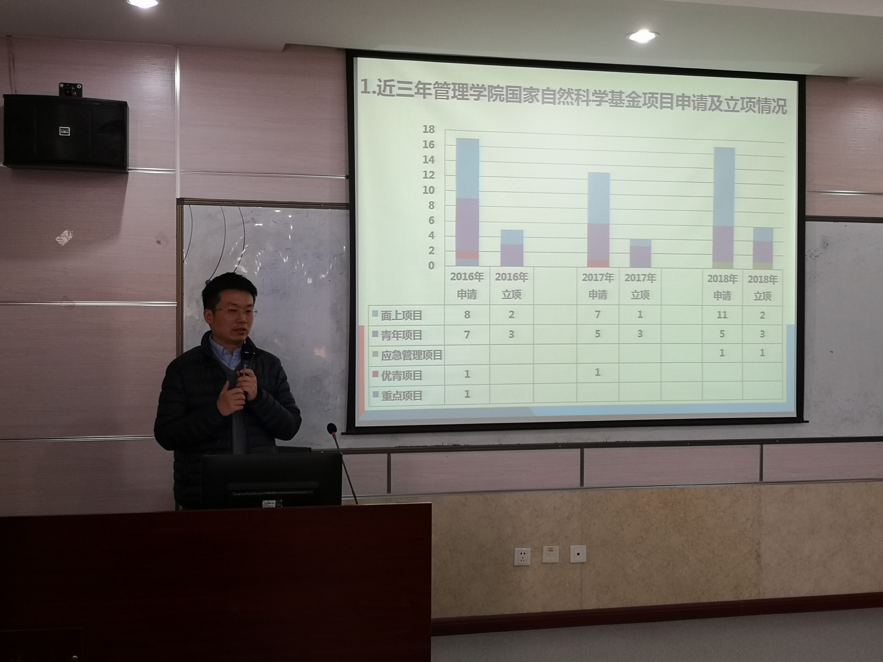 贾明副院长分析了学院近3年的国家自然科学基金、国家社科基金申报和立项情况,并提出希望学院具备申请2019年度国家级基金项目资格的老师都能积极行动起来,提早谋划,精心准备,学院将通过举办选题指导会、辅导报告会、一对一指导等多种形式切实提高基金申报书质量。