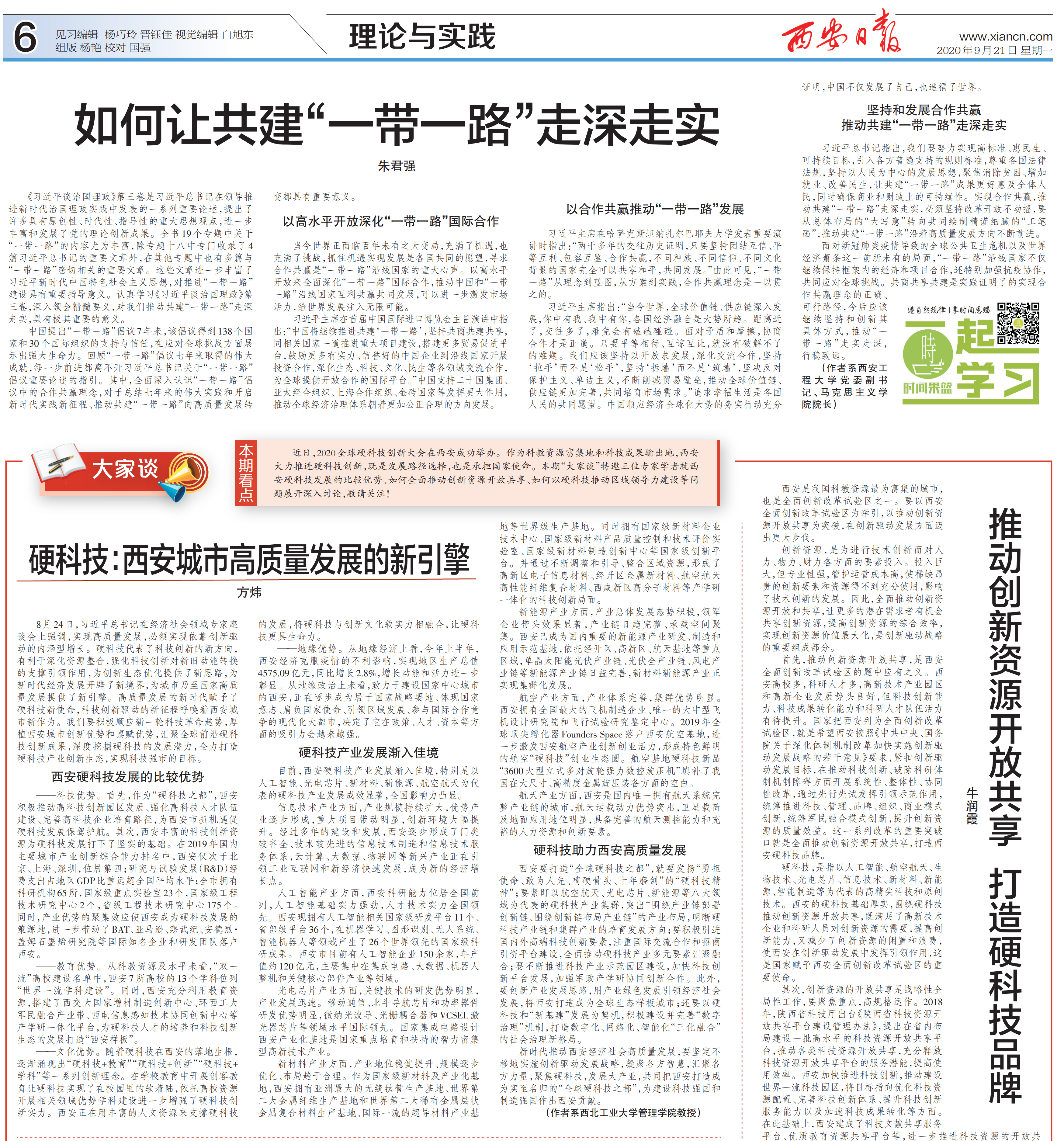 9月21日,《西安日报》第6版理论与实践“大家谈”栏目刊发了新葡的京集团35222vip方炜教授撰写的理论文章——硬科技:西安城市高质量发展的新引擎。文章以本次大会的成功举办为契机,从几个“新”的角度阐述了硬科技对西安城市高质量发展的关键作用,硬科技代表了科技创新的“新”方向,为创新生态优化提供了“新”思路,为新时代经济发展开辟了“新”境界,为城市乃至国家高质量发展提供了“新”引擎;高质量发展的“新”时代赋予了硬科技“新”使命,科技创新驱动的“新”征程呼唤着西安城市“新”作为。文章从科技、教育、文化和地缘四个方面系统分析了西安市硬科技发展的比较优势,并总结了西安市以人工智能、光电芯片、新材料、新能源、航空航天为代表的硬科技产业发展方面做出的显著成绩。