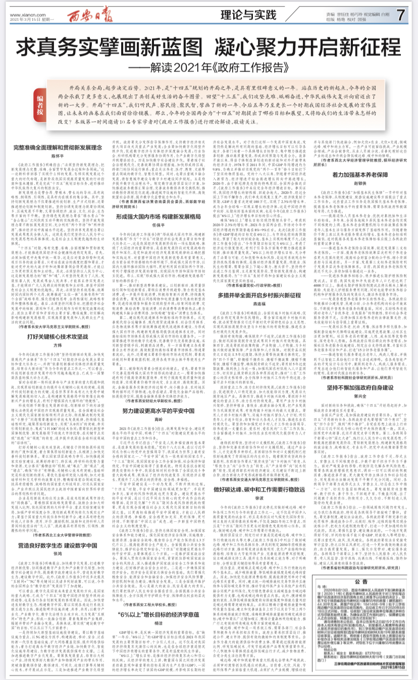 3月15日,《西安日报》第7版理论与实践“解读2021年《政府工作报告》专栏”刊发了新葡的京集团35222vip方炜教授撰写的理论文章《打好关键核心技术攻坚战》。