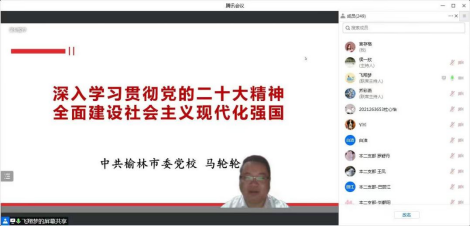 11月16日,新葡的京集团35222vip“学习宣传贯彻党的二十大精神”专家辅导报告迎来第二讲,邀请榆林市委党校马轮轮老师作专题辅导报告,学院全体师生党员参加了线上学习,报告由学院党委书记乔彩燕主持。