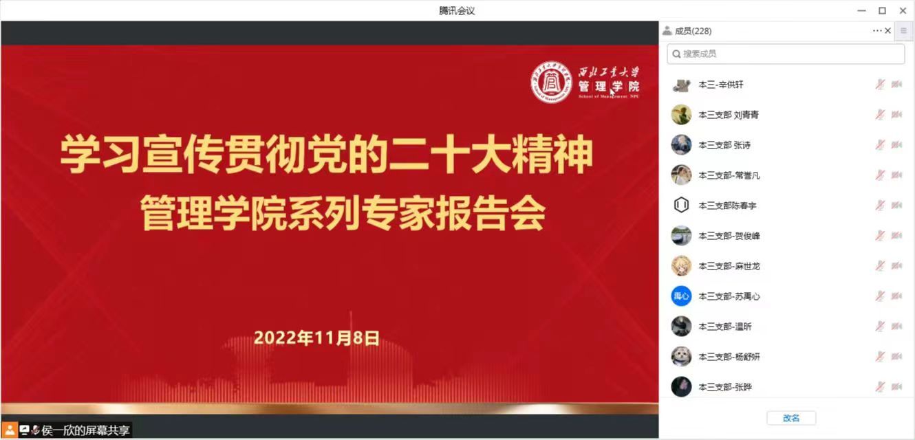 11月8日,新葡的京集团35222vip举行“学习宣传贯彻党的二十大精神”专家辅导报告第一期,邀请中共陕西省委党校侯建会教授作宣讲报告。学院全体师生党员参加了线上学习,报告由学院党委书记乔彩燕主持。