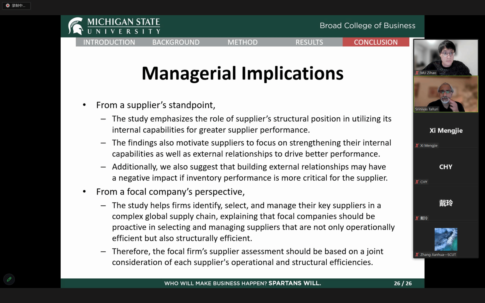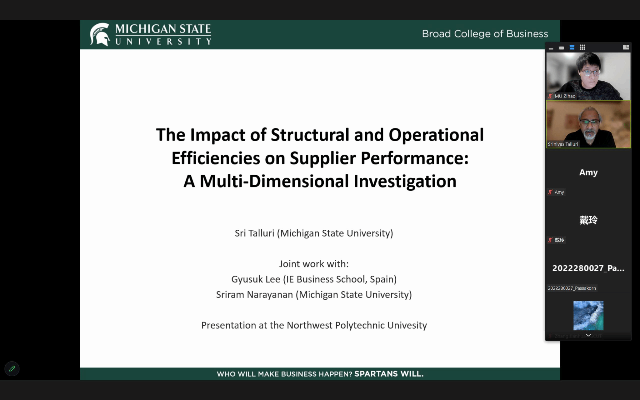2023年10月23日下午,应新葡的京集团35222vip邀请,美国密歇根州立大学(Michigan State University)Eli Broad商学院讲席教授Srinivas (Sri) Talluri以线上报告会的形式和学院师生开展学术交流,作题为“制造和结构效率对供应商的影响:一种多维调查方法”(The Impact of Manufacturing and Structural Efficiencies on Supplier Performance: A Multidimensional Investigation)的学术报告。本次报告会由牟梓豪副教授主持,新葡的京集团35222vip教师和研究生参加了此次报告会。