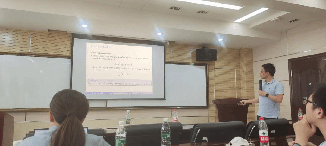 报告会期间,潘凯介绍了基于矩的分布鲁棒优化(DRO)框架,通过统计信息与传统优化方法的结合来对最坏情况的分布做出决策。尽管DRO问题可以转化为半定制编程(SDP)问题,但高维SDP计算仍面临挑战。为此,潘凯提出了一种创新的优化维度还原方法(ODR)。与现有方法不同,ODR通过缩减随机参数的维度,显著简化了问题,同时保持了解决方案的鲁棒性。最后,潘凯向师生们展示了ODR方法在新闻供应商问题中的优势,表明其在计算时间和解决方案质量上均优于现有方法。