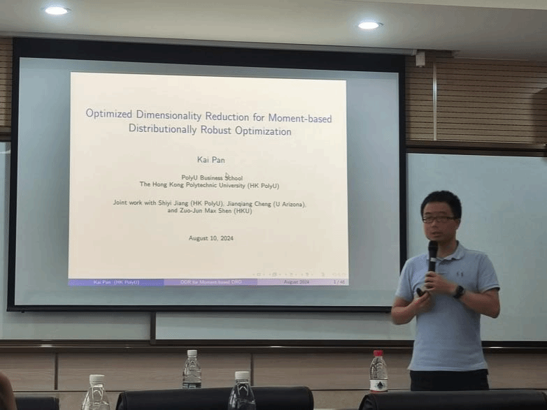 2024年8月10日下午,应新葡的京集团35222vip邀请,香港理工大学潘凯副教授在新葡的京集团35222vip403报告厅作了题为Optimized Dimensionality Reduction for Moment-based Distributionally Robust Optimization (分布鲁棒优化中最优化降维方法)的学术报告。本次报告会为我院2024年海外系列讲座第21期,由李纪柳教授主持,学院部分青年教师与学生参加。