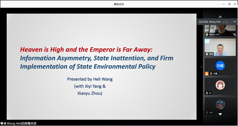 2020年8月10日下午,应新葡的京集团35222vip贾明教授邀请,新加坡管理大学王鹤丽教授通过腾讯会议平台为我院做了题为“Heaven is High and the Emperor is Far Away: Information Asymmetry, State Inattention, and Firm Implementation of State Environmental Policy”的学术报告。本次报告由贾明教授主持,我院师生共100余人参与了此次报告。
