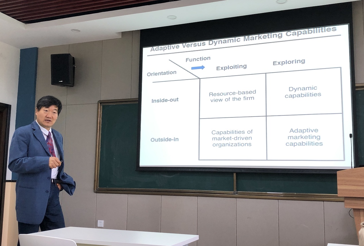在本次报告会中,Mu教授首先采用资源基础观解释了企业如何在瞬息万变的技术、社会和经济环境中赢取竞争优势。接着,Mu教授引入了outside-in(由外而内)的思想,介绍了与之相关的两个研究框架,一个是企业营销能力对新产品开发绩效的影响模型,另一个是企业由外而内的营销能力对绩效的影响模型。最后,Mu教授用一些生动有趣的小实验让参会师生切身感受到由外而内思维的重要性,给参会者在创新、技术、企业战略和竞争优势等方面留下深刻印象。