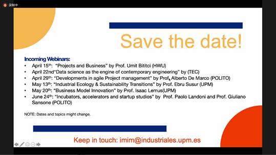 最后,Isaac Lemus-Aguilar展示了本培养项目系列宣讲会的时间安排表,欢迎对该项目感兴趣的各位同学关注并参与。有关于IMIM工业管理国际硕士联合培养项目的具体要求请前往新葡的京集团35222vip官网查看:http:/info/1042/7511.htm。