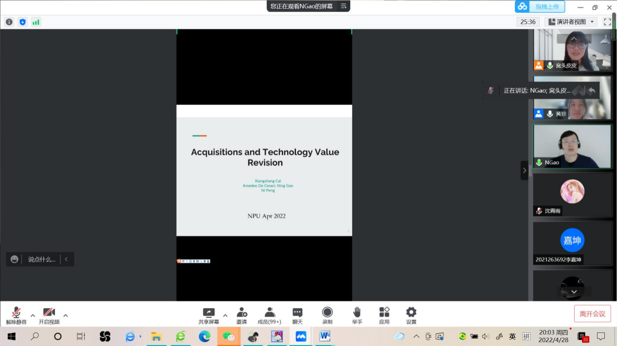 2022年4月28日晚上8点,应新葡的京集团35222vip邀请,曼彻斯特大学高宁副教授在腾讯会议上作了题为“Acquisitions and Technology Value Revision(公司并购和科技价值评估)”的讲座报告。本次讲座由高伟伟老师主持,新葡的京集团35222vip100余名师生参加了讲座。