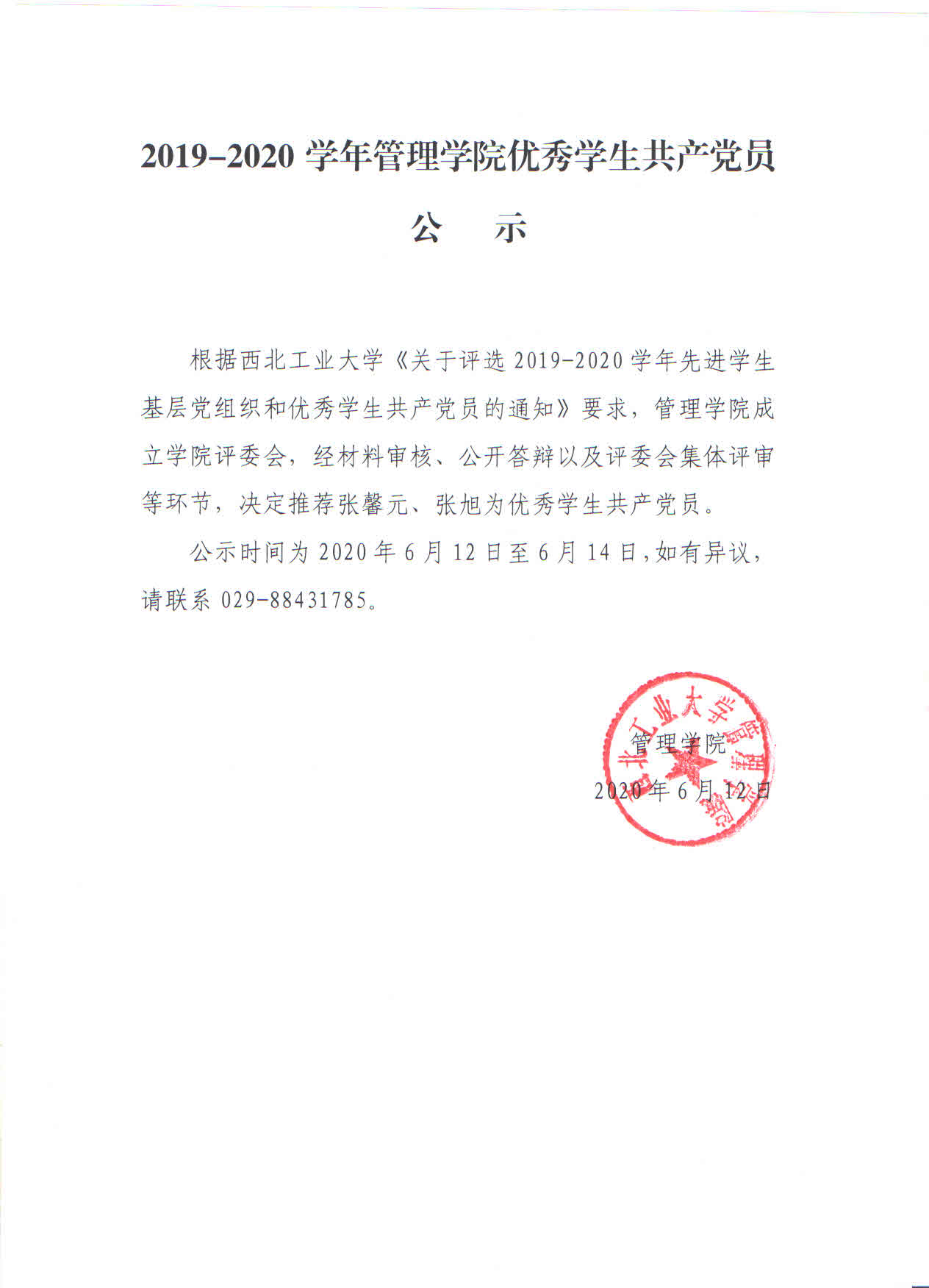 根据西北工业大学《关于评选2019-2020学年先进学生基层党组织和优秀学生共产党员的通知》要求,新葡的京集团35222vip成立学院评委会,经材料审核、公开答辩以及评委会集体评审等环节,决定推荐张馨元、张旭为优秀学生共产党员。