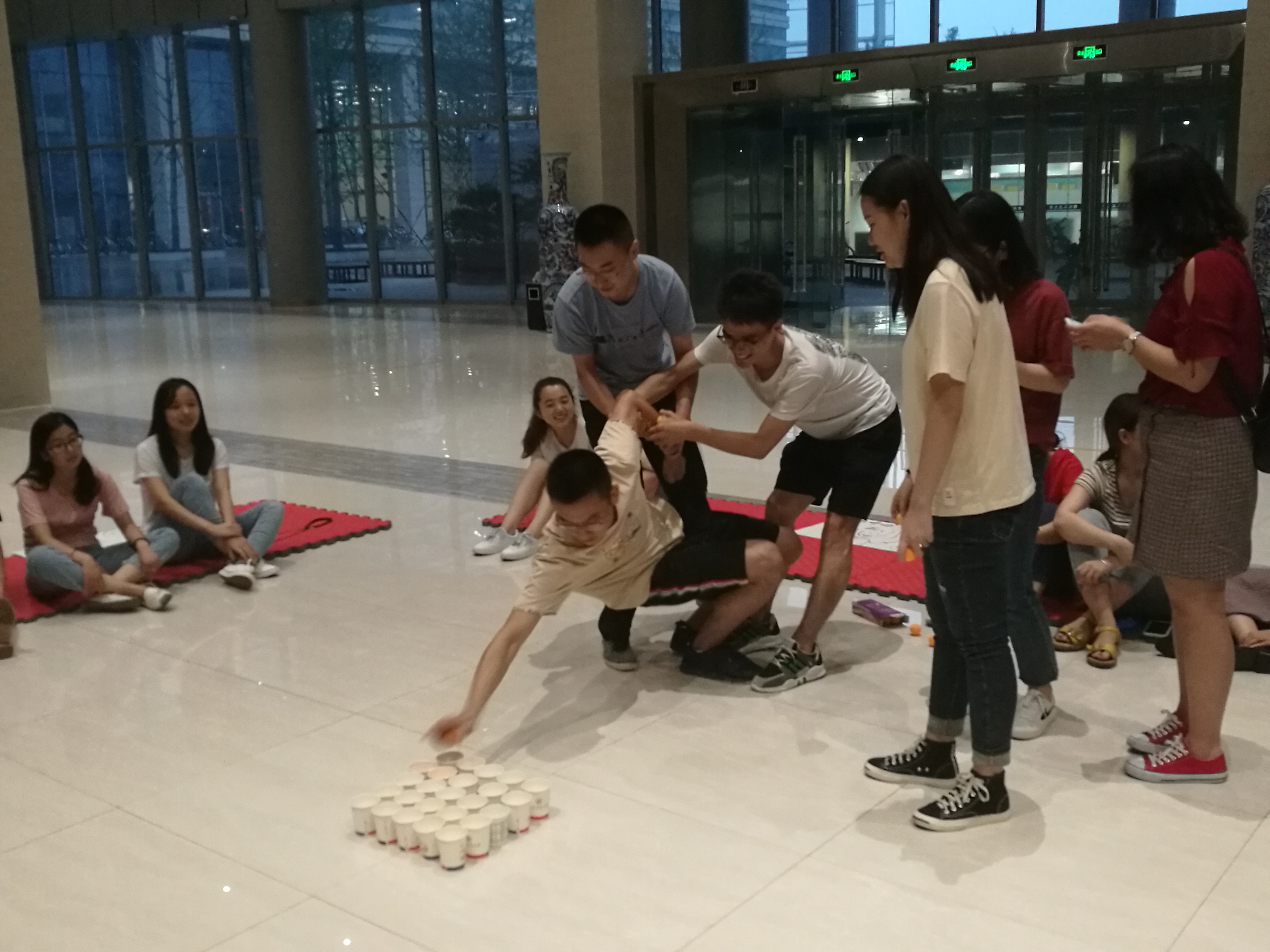 活动进入第二个环节-团队连连看。各队成员各有分工、通力协作,在考验团队协作的5×5纸杯方阵中投掷乒乓球,并回答相应的党建知识问题。首先完成连线的队伍积最高分。最终,吧啦咘啦队的5名队员靠着超强的配合与深厚的党建知识积累,仅用时1分39秒拆摘桂冠。