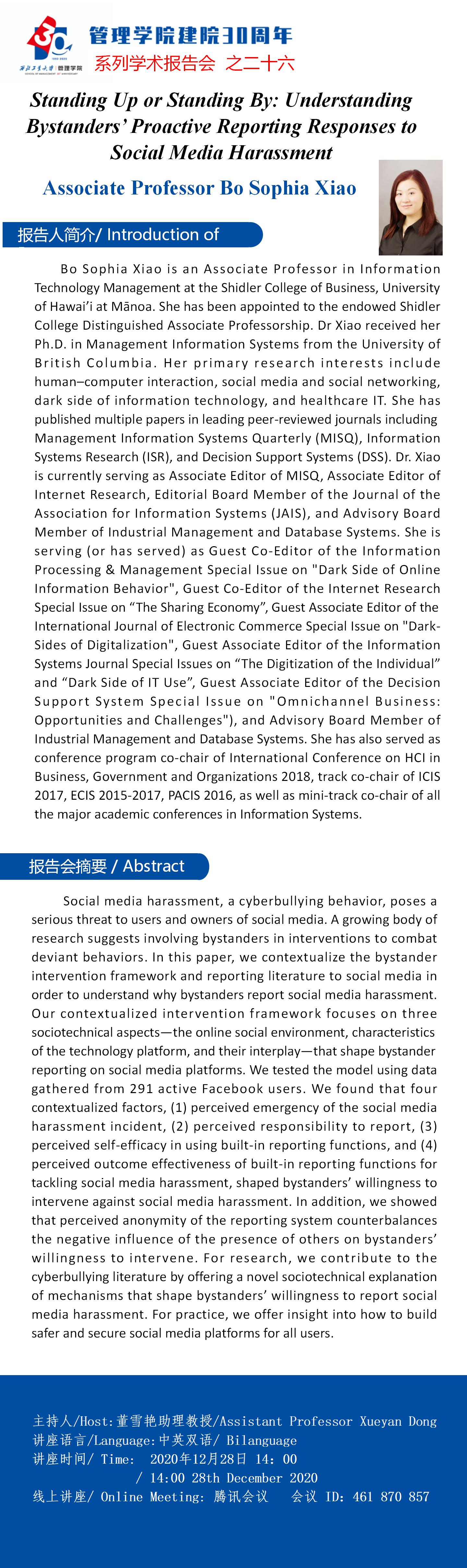 上一条:【新葡的京集团35222vip建院30周年系列学术报告会之二十七】Can Positive Online Social Cues Always Reduce User Avoidance of Sponsored Search Results?