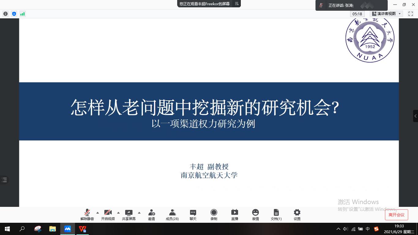 2021年6月29日晚上,南京航空航天大学副教授丰超老师做了题为“怎样从老问题中挖掘新的研究机会——以一项渠道权力研究为例”的报告。报告通过腾讯会议平台直播,由张涛副教授主持,新葡的京集团35222vip老师学生参加了本次报告。