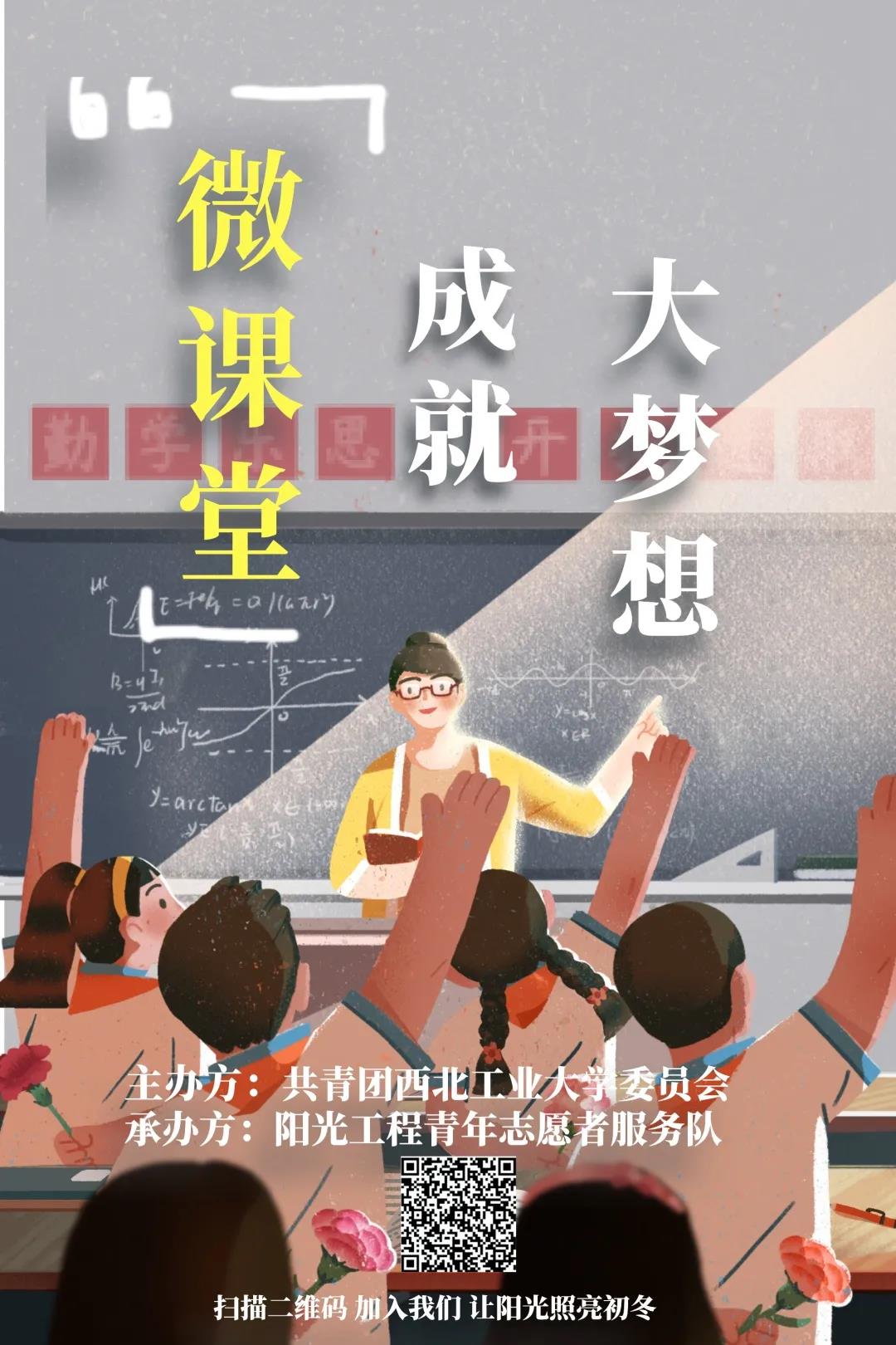 西北工业大学阳光工程青年志愿者服务队也积极响应西北工业大学团委的号召,以自身22年的支教历史与经验为基础,依托阳光工程“互联网+支教”项目所搭建的山区远程线上支教体系,推出了阳光工程青年志愿者服务队“互联网+微课堂”活动。