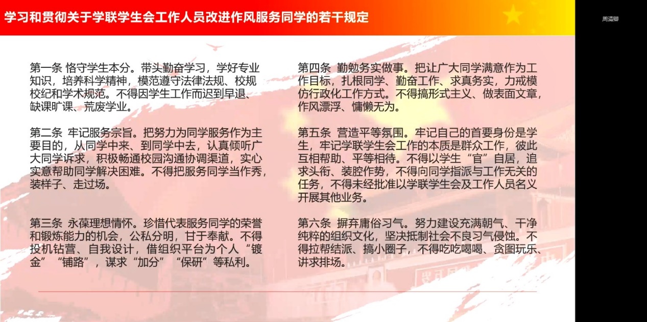 会上,主席团成员陈海峰为全体学生会成员宣读了《关于学联学生会工作人员改进作风服务同学的若干规定》。