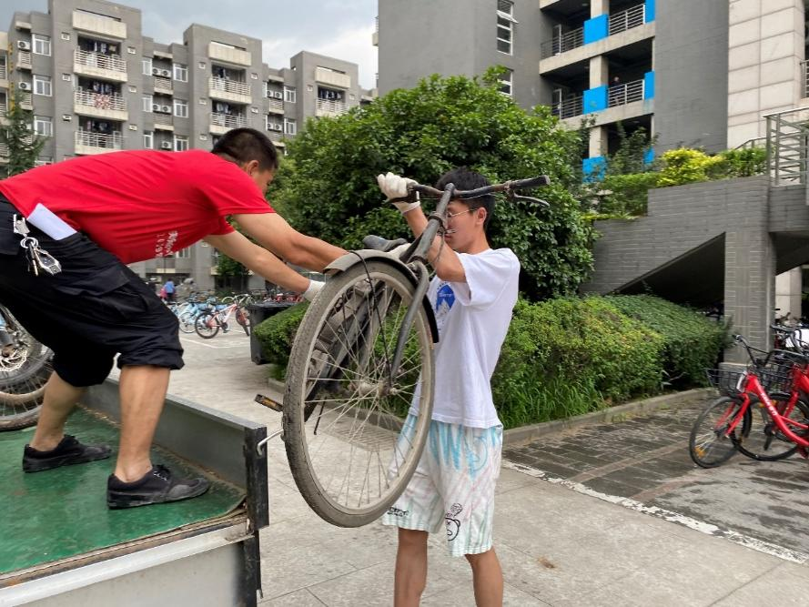 在校工作人员的引导下分区域完成废旧自行车的整理和搬运工作。