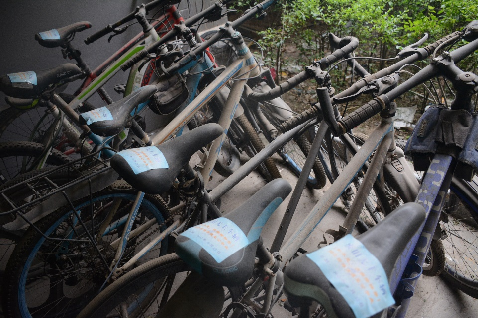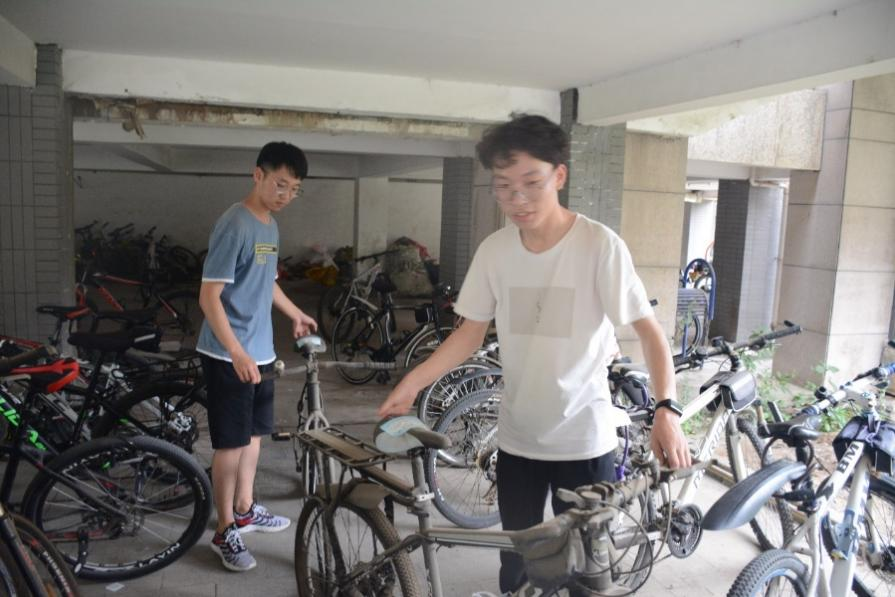在同学们的团结协作和不懈努力下,原来废弃积灰、锈迹斑斑的自行车终于被清理干净,杂乱的停车位也变成了整洁起来,生活区和教学楼下又有了很多可供同学们停放自行车的位置。